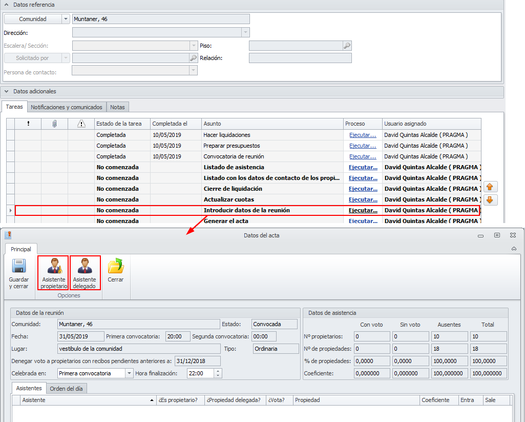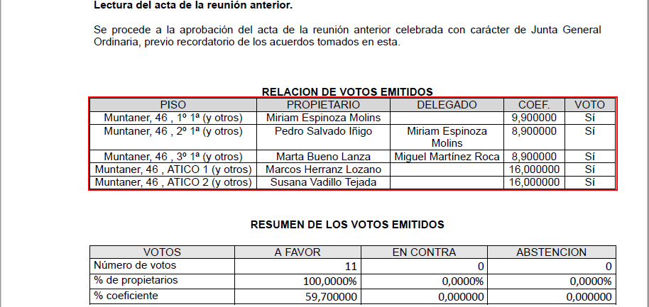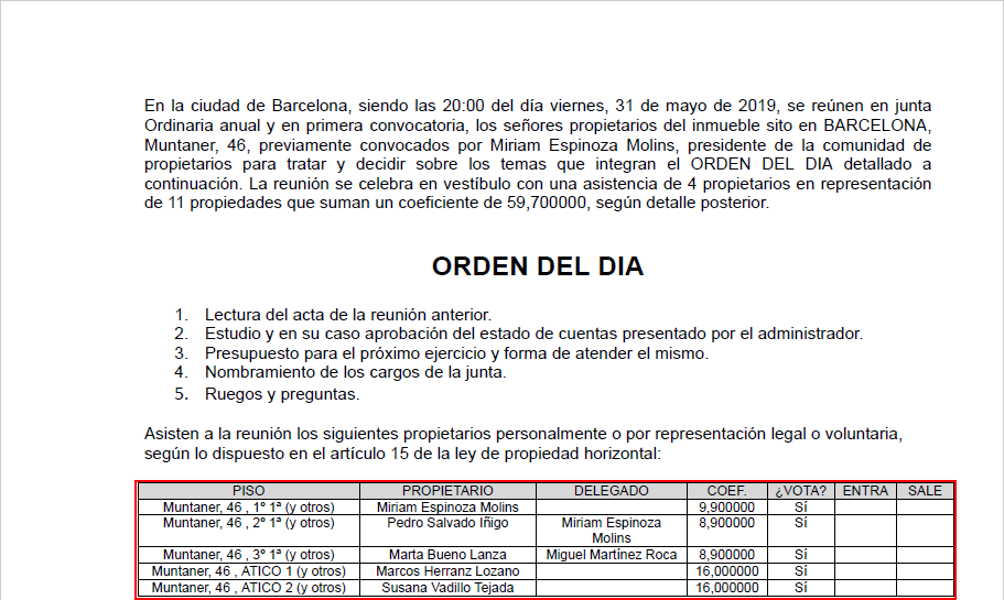 Se ha mejorado la lista de asistentes en el acta, mostrando en sendas columnas el nombre del propietario y el del delegado, en caso de haberlo.