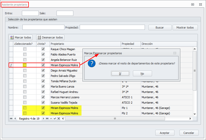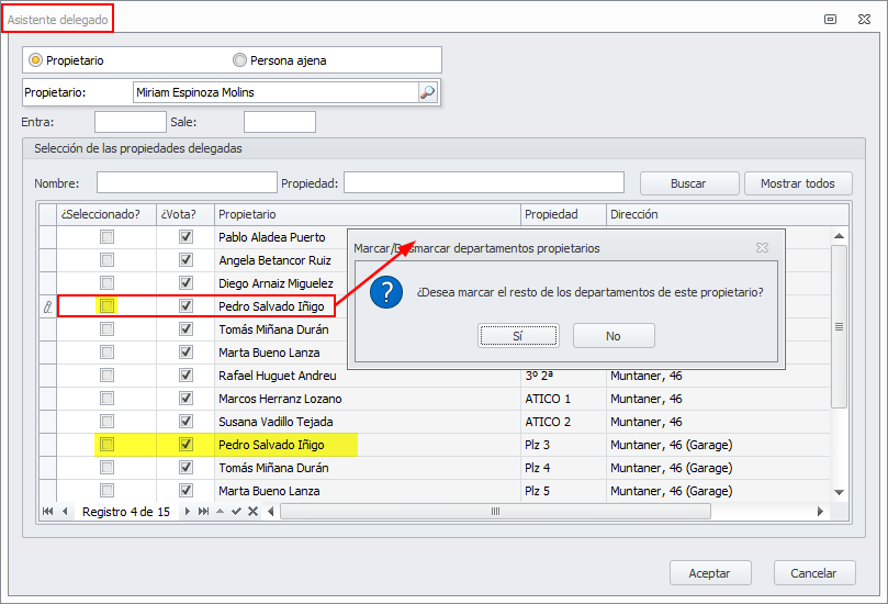 En la misma ventana, cuando se identifica un asistente delegado, al seleccionar el propietario al que representa, adminet analiza si el mismo propietario tiene otros departamentos. En ese caso pide al usuario si desea seleccionar también el resto de departamentos.