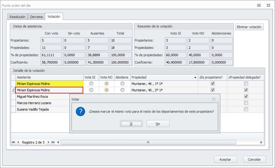 Por último, en la ventana de votaciones, si un mismo asistente representa a diferentes propietarios (por delegación), al cambiar el sentido de su voto, adminet analiza si el voto de sus otras representaciones es diferente. En ese caso pide al usuario si desea cambiar el sentido del voto en todos los casos.