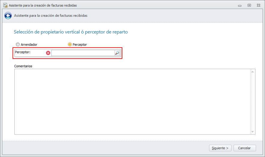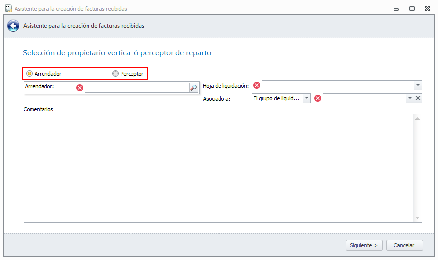 En la siguiente imagen puede ver la ventana del asistente de nueva factura de industrial en la que se puede escoger si corresponde a un arrendador o a un perceptor.