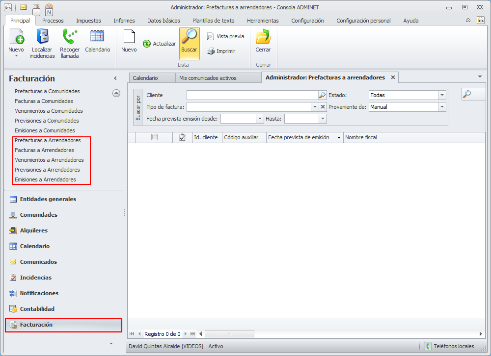 Apartado Facturación -> Facturas a arrendadores