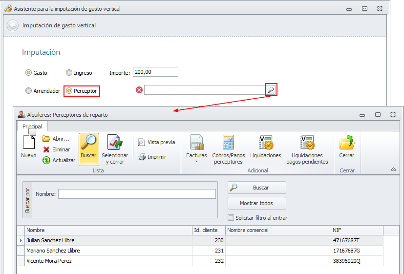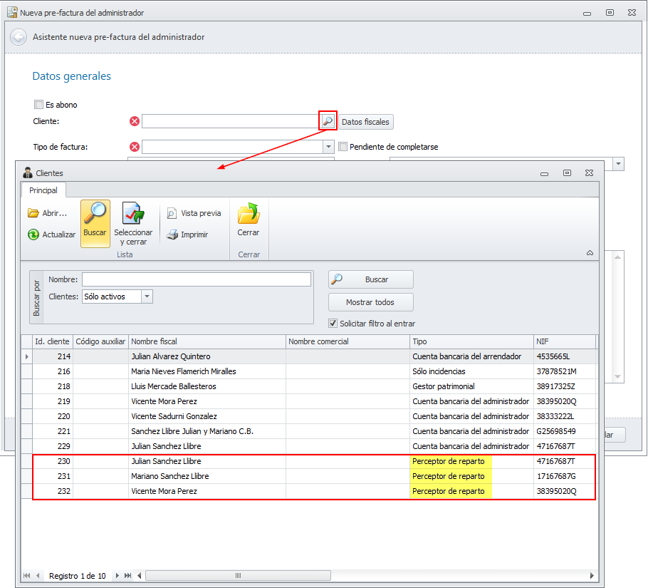 Al dar de alta una previsión o una pre-factura desde las opciones de arrendadores e identificar el cliente, también se incluyen en la lista los perceptores de reparto.