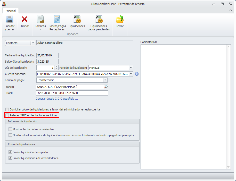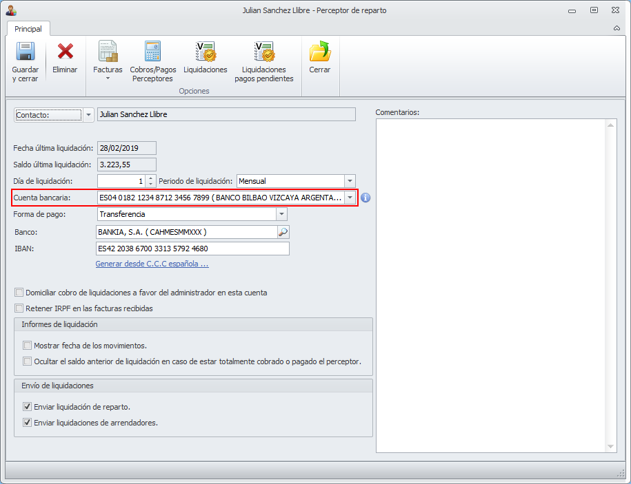 Se ha añadido en la ficha del perceptor de reparto una nueva casilla para escoger la cuenta bancaria del administrador desde la que se pagarán, por defecto, las facturas relacionadas con este perceptor.