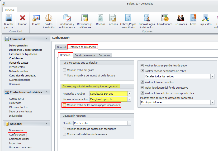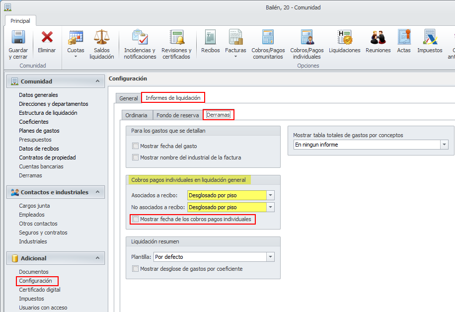 Se han incorporado nuevas casillas en la configuración de los informes de liquidación de las fichas de comunidad y macrocomunidad, con el objetivo de que se pueda escoger si mostrar o no la fecha de los cobros pagos individuales.