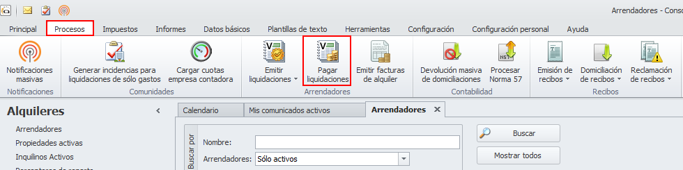 Menú Procesos -> Domiciliar vencimientos (Arrendadores)