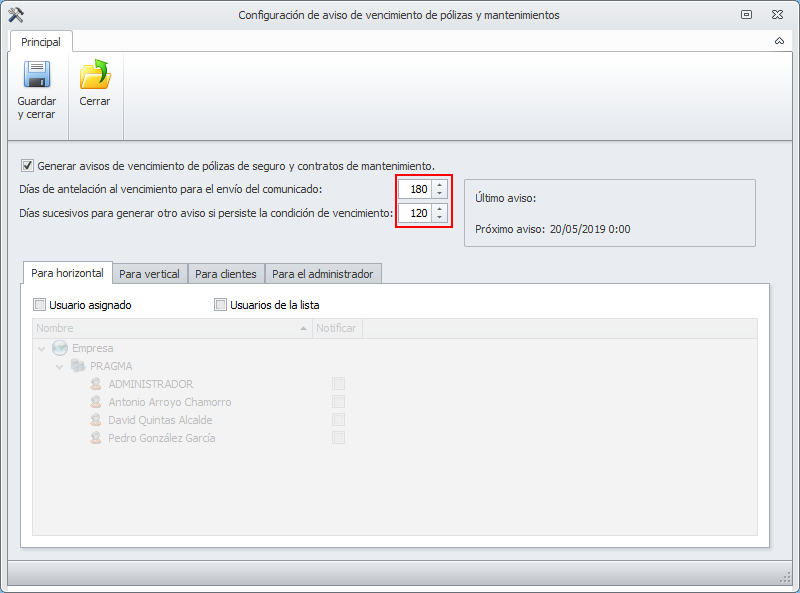 A continuación, puede ver un ejemplo de la ventana de avisos de vencimiento de pólizas y mantenimientos.