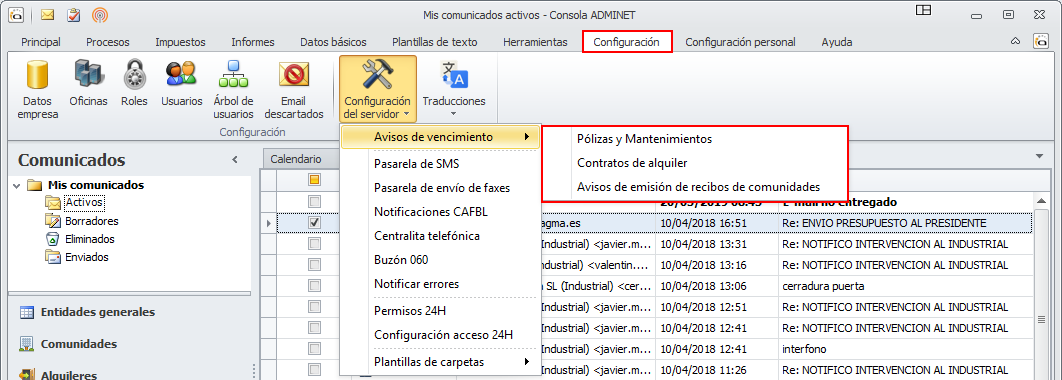Avisos de notificación (e-mail, SMS, FAX) de emisión de recibos, convocatorias, actas...