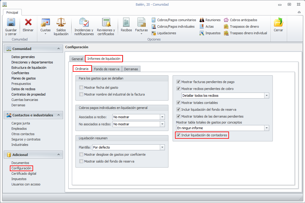 Por defecto se muestra activado. En caso de desactivarse, si la comunidad tiene contadores asociados, al emitir la liquidación ordinaria no se incluirá la información referente a esos contadores.