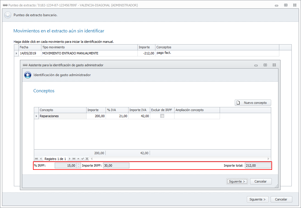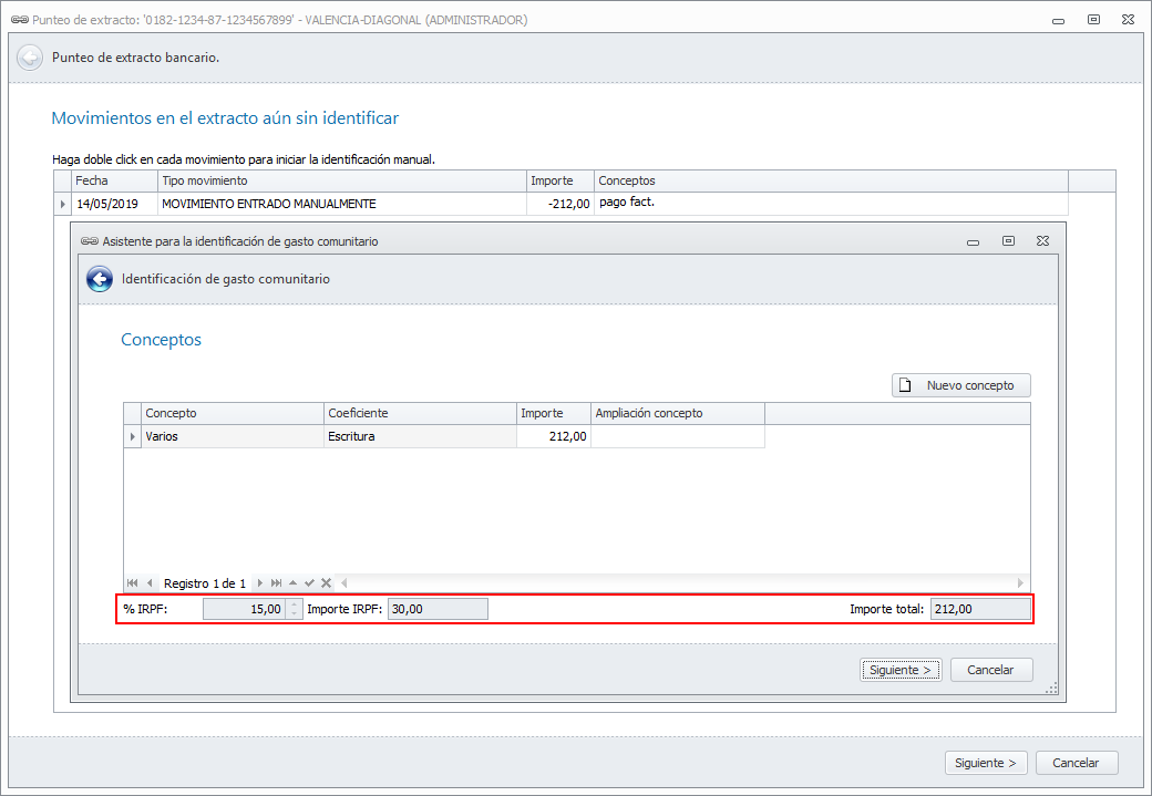 Se han modificado los procesos de identificación de movimiento de comunidades de forma que, si se va a crear una nueva factura de un industrial que aplica retención de IRPF, se muestra la retención en la ventana donde se detallan los importes.