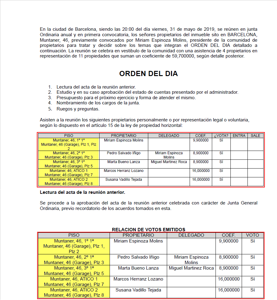 Mejoras en el documento del acta, relacionadas con propietarios que tienen varios departamentos