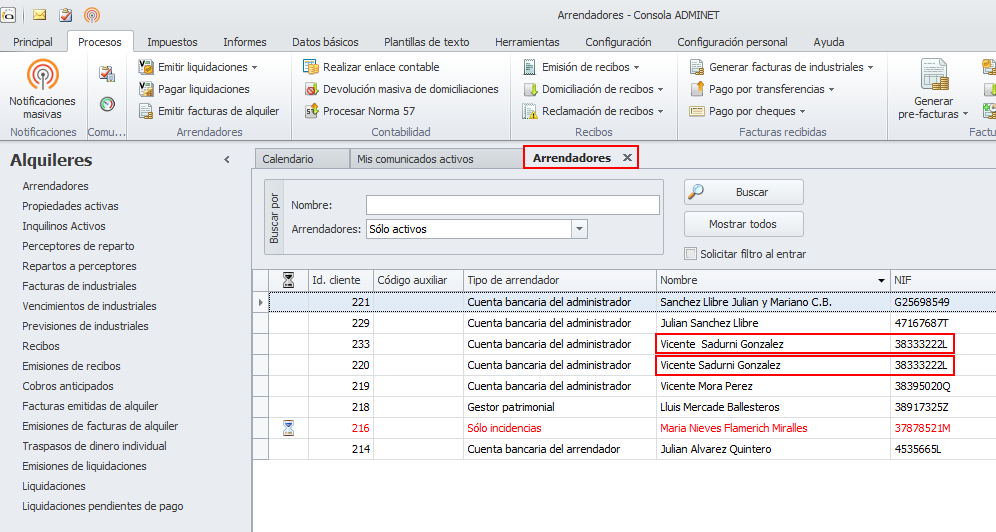 Se ha ajustado el proceso de emisión de facturas de alquiler para que el numerador de facturas se gestione por NIF de arrendador. De este modo, si se diera la circunstancia de que dos arrendadores tuvieran el mismo NIF, ambos utilizarían el mismo numerador.