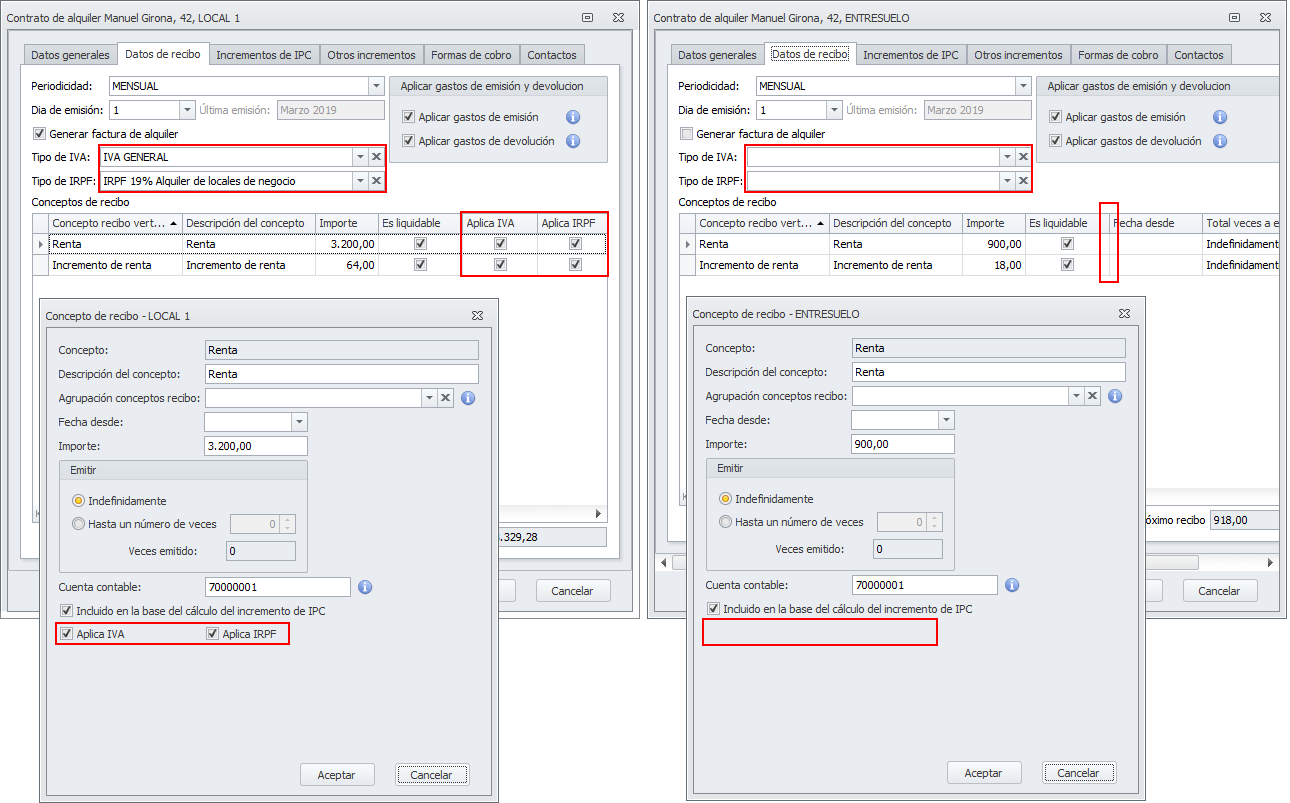 En la parte superior de la pestaña Datos de recibo se determina si se aplica IVA y retención de IRPF a los conceptos del recibo. A partir de ahora, si no tiene IVA, no mostrará la columna Aplica IVA. El mismo comportamiento se aplica a la retención de IRPF. Este comportamiento se aplica también en la ficha de detalle del concepto. A continuación puede ver como se muestra un contrato que aplica IVA e IRPF y otro que no.