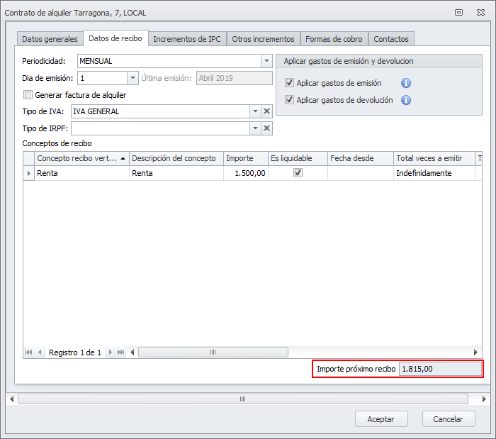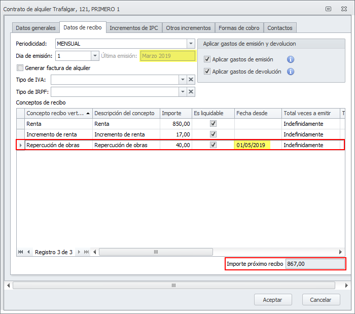 En el siguiente ejemplo puede ver un contrato con una línea de repercusión de obras que se emitirá desde el 01/05/2019. Como que el último recibo se emitió en marzo-2019 (y por lo tanto el próximo recibo se emitirá en abril) ese concepto no es tenido en cuenta en el Importe próximo recibo.