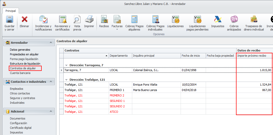 El Importe próximo recibo también es incluido en la lista de contratos de alquiler de la ficha del arrendador. Este dato ya existía pero no tenía en cuenta la fecha de próxima emisión de recibo ni el IVA e IRPF.