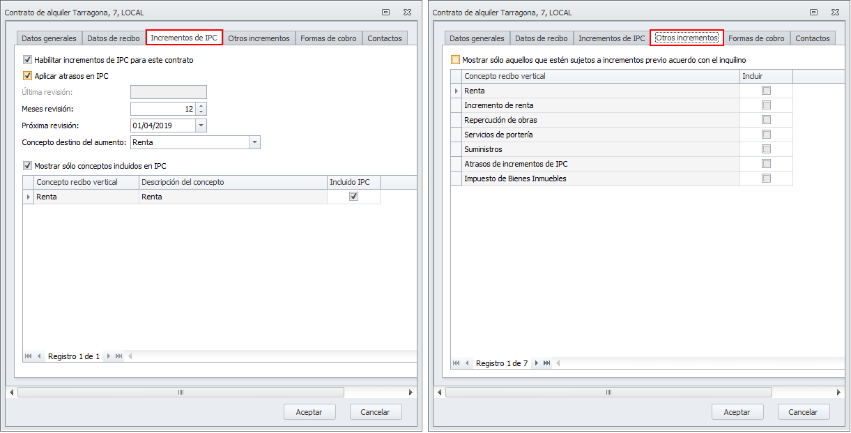 La pestaña Incrementos ha sido sustituida por otras dos, tituladas Incrementos de IPC y Otros incrementos.