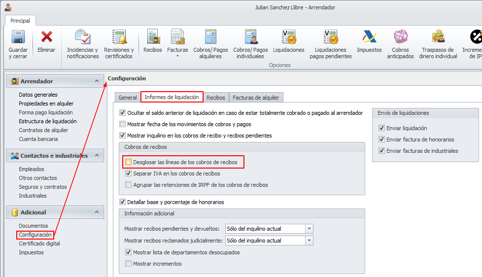 Se ha añadido la posibilidad de que la liquidación del arrendador desglose los conceptos del cobro de recibos. Esta opción es independiente para cada arrendador. Si lo desea activar, abra la ficha del arrendador, sitúese en la sección Configuración, haga clic en la pestaña Informes liquidación, y active la casilla Desglosar las líneas de los cobros de recibos.