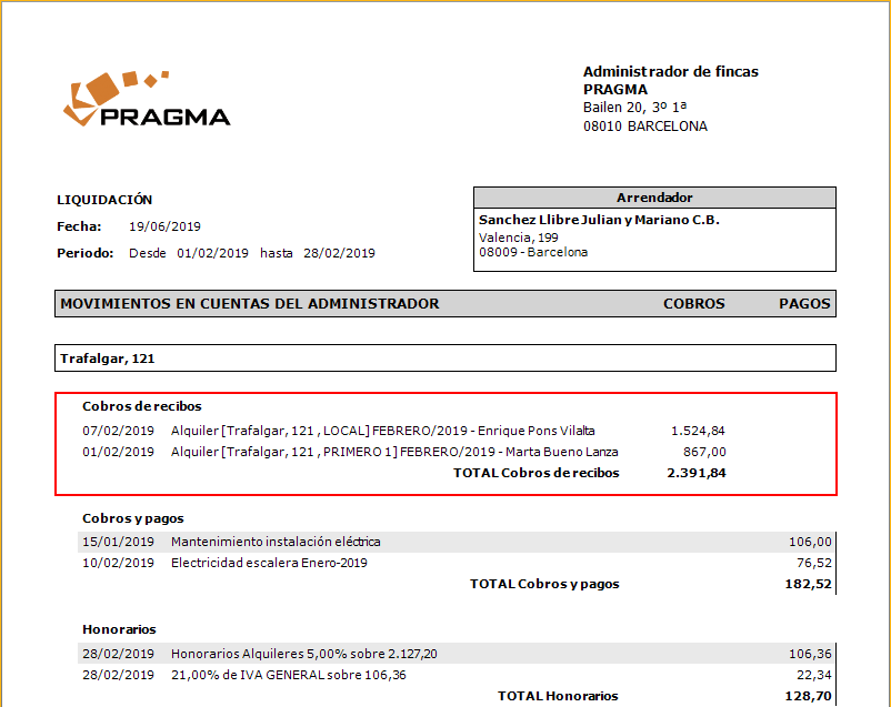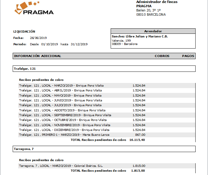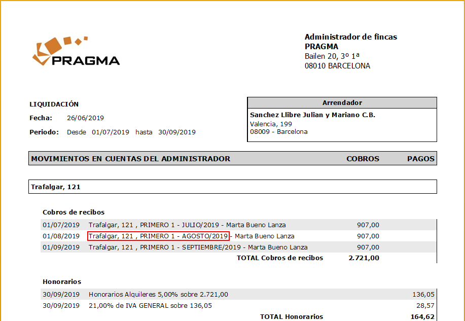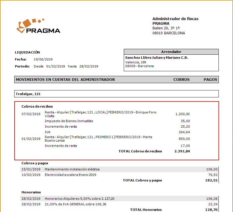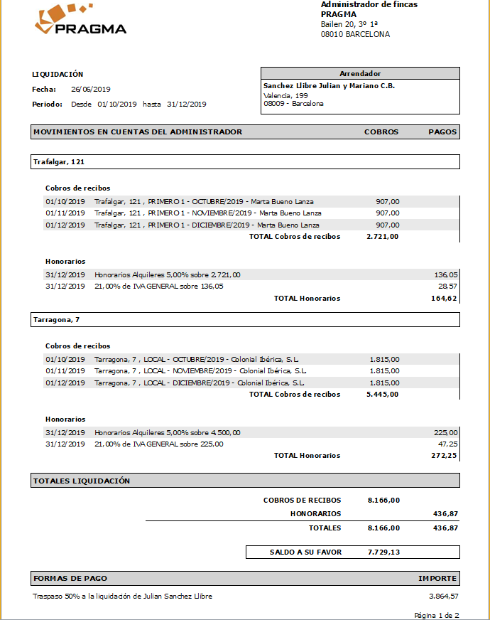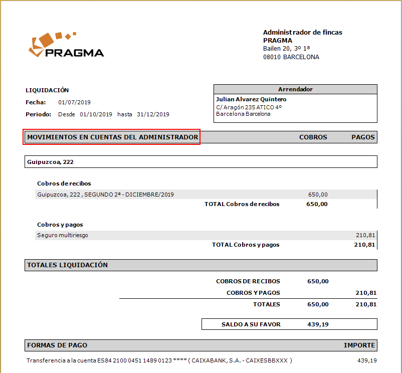 Un segundo apartado con los movimientos registrados desde las cuentas del administrador. También se totalizan cobros y pagos, obteniendo el saldo de liquidación e informando de la forma de pago o cobro pactada.
