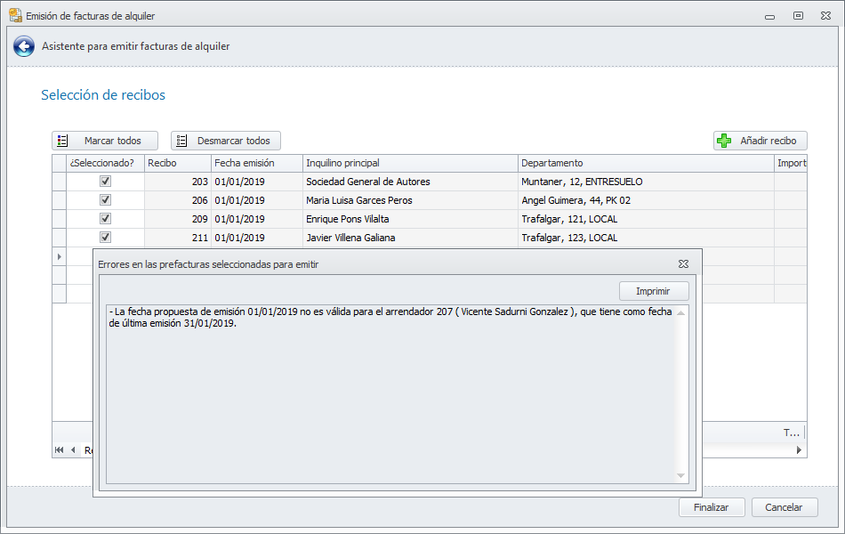 Si se da este caso puede realizar el proceso con otra fecha que permita la emisión de todas las facturas o bien desmarcar los inquilinos del arrendador con facturas emitidas en fecha posterior y procesar, posteriormente, las facturas de ese arrendador con otra fecha.
