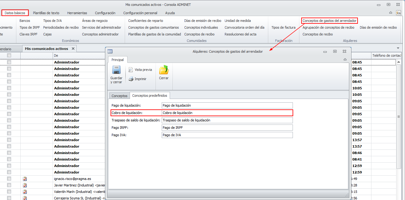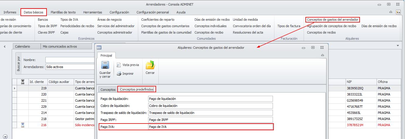 Para registrar el cobro de las liquidaciones se ha creado un nuevo concepto predefinido en los Conceptos de gastos del arrendador.