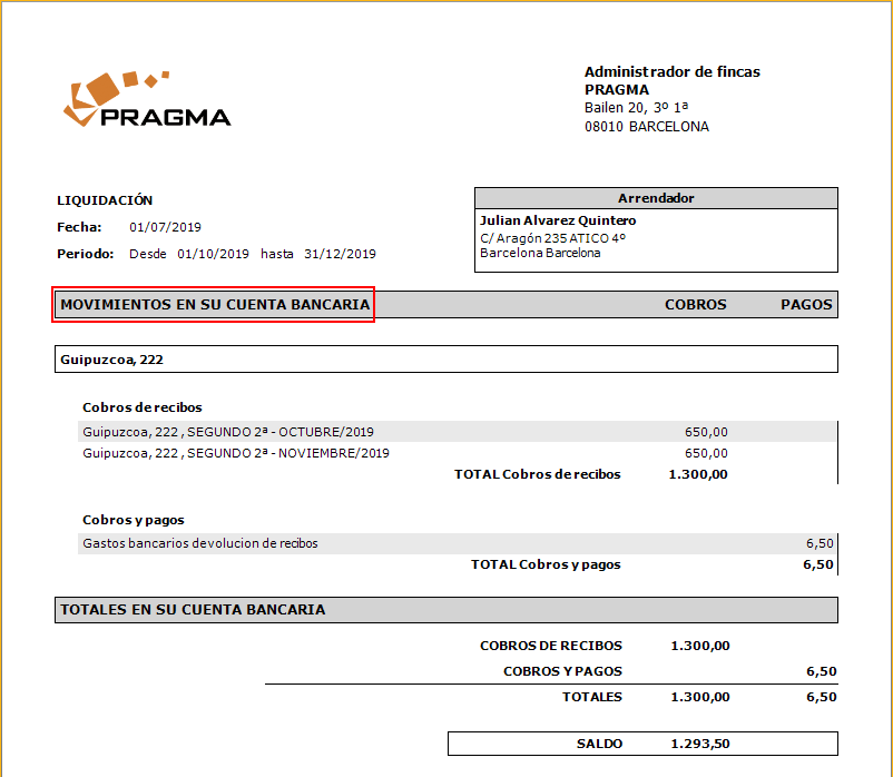 Un primer apartado con los movimientos registrados desde la cuenta del arrendador. Se totalizan los cobros y pagos y se informa del saldo del periodo liquidado.