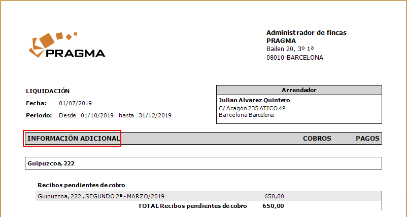 Un tercer apartado con información adicional. En este apartado se detallan los recibos pendientes, los incrementos aplicados y los departamentos desocupados.