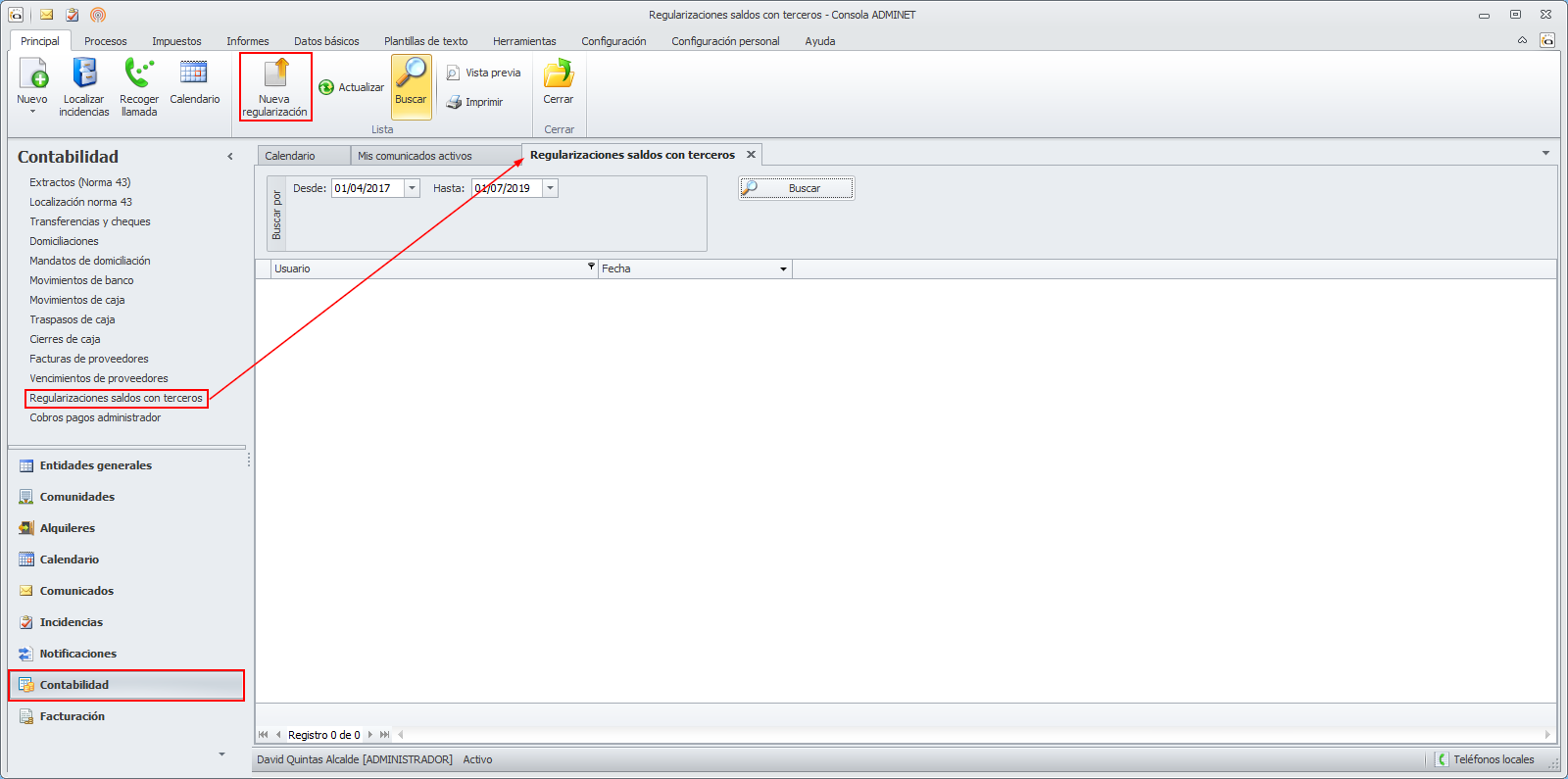 Al encargarse la propia liquidación de regularizar el saldo entre el arrendador y el administrador, se ha suprimido del proceso de Regularización de saldos con terceros la posibilidad de regularizar movimientos de alquileres.