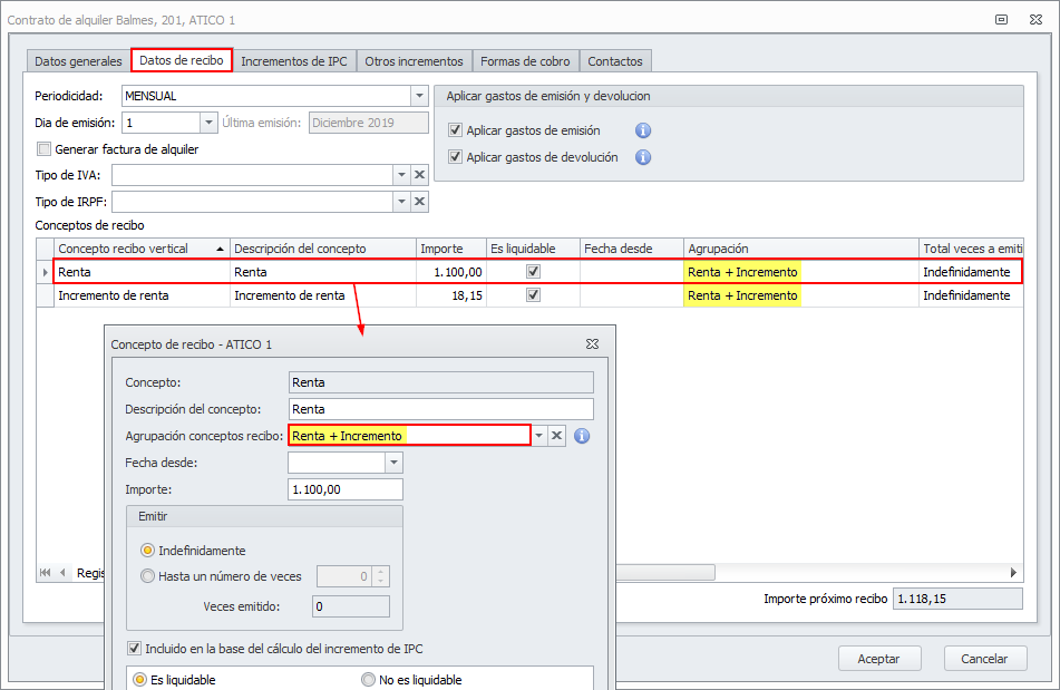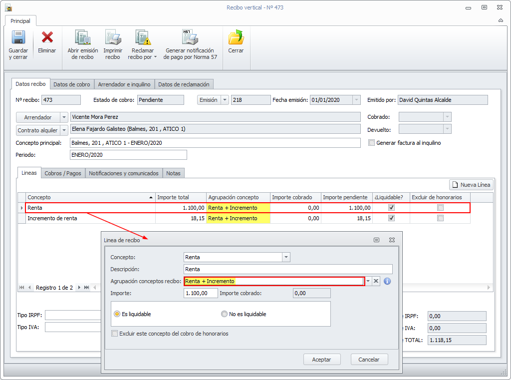 Si un contrato de alquiler tiene líneas de recibo con agrupación de conceptos, al generar un recibo no se agrupan las líneas con la misma agrupación, sino que se añaden al recibo todas las líneas de concepto junto a su agrupación.