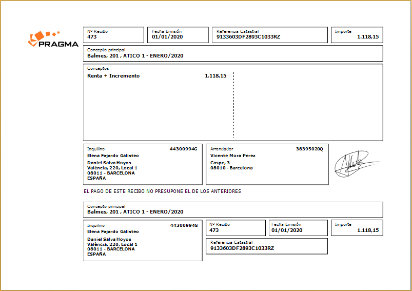 Por último, vea el recibo impreso, juntando la renta y los incrementos en una sola línea, gracias a la agrupación de concepto.