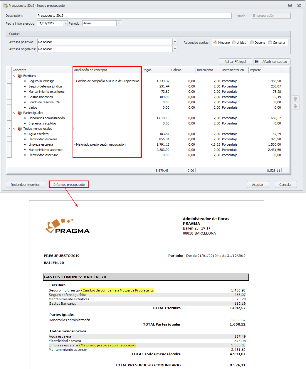 Se ha modificado el asistente y la ficha del presupuesto para que se pueda añadir una ampliación de concepto (de hasta 150 caracteres) a las líneas de gastos, permitiendo al administrador aclarar las partidas del mismo que desee. Esta ampliación de concepto es mostrada también en los informes del presupuesto.