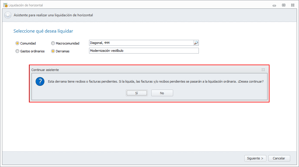Se ha modificado el proceso de emisión de liquidaciones de derramas para que, en el caso de que tenga recibos pendientes de cobro o facturas pendientes de pago, muestre un aviso al usuario y le permita emitirla de todos modos.