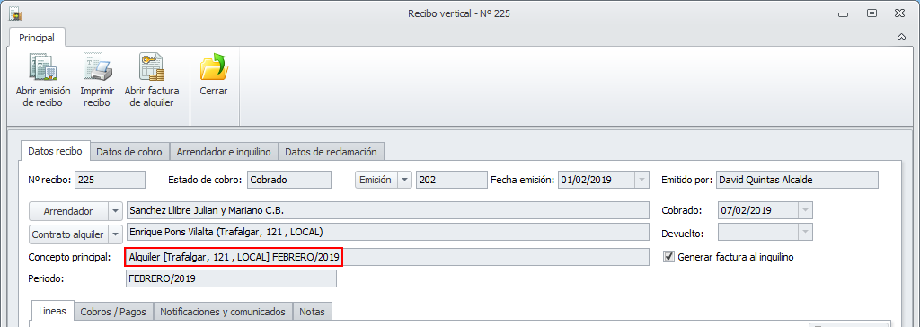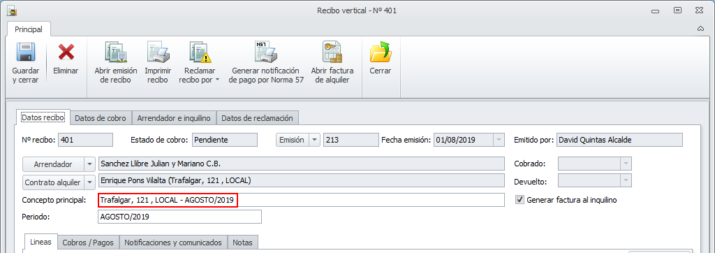 Se ha modificado el texto que se guarda en la casilla Concepto principal del recibo. A continuación, puede ver como anteriormente se componía del texto Alquiler, seguido de la dirección del departamento entre corchetes y el periodo del recibo.