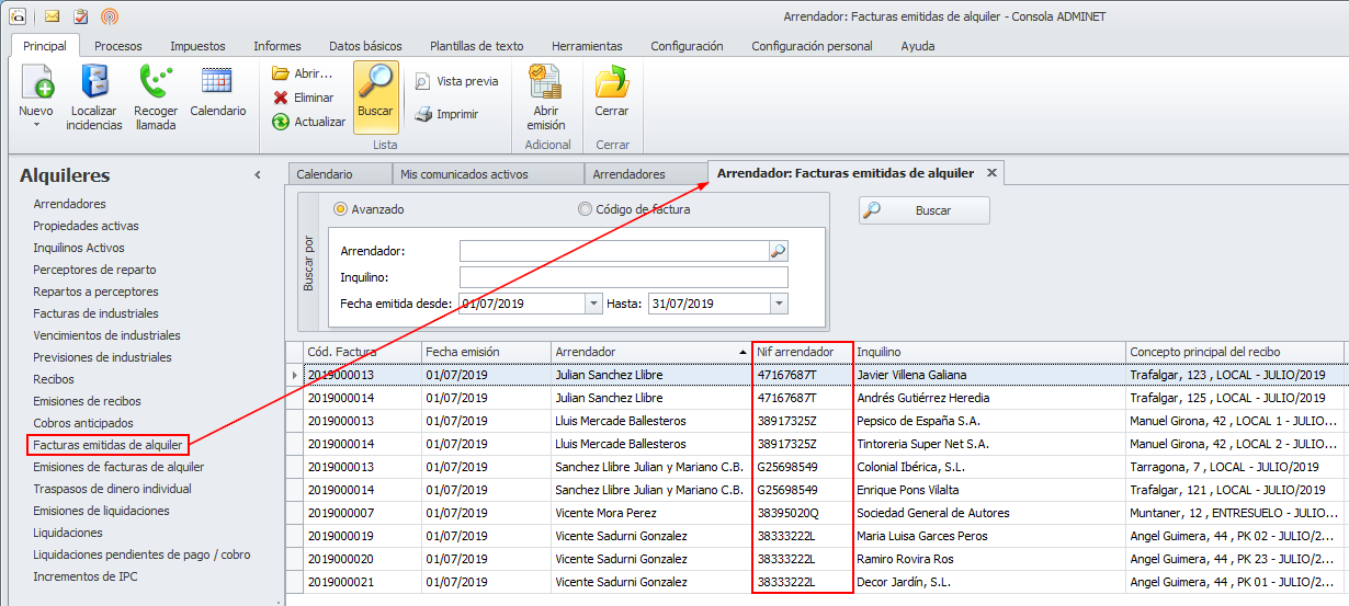 Para facilitar la identificación del emisor de las facturas, se ha incorporado también la columna NIF arrendador en la vista de Facturas emitidas de alquiler.