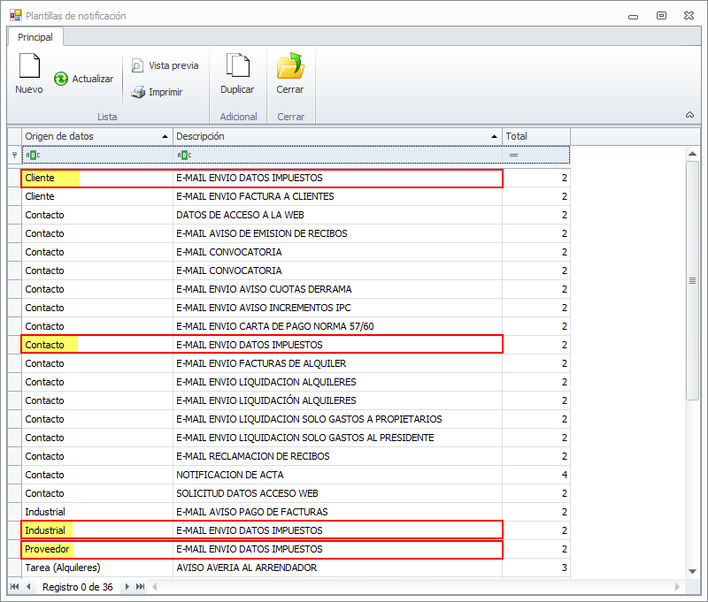 Se han incorporado 4 nuevas plantillas de notificación a clientes, , con la finalidad de ser ofrecidas por defecto en el envío de documentación tributaria a proveedores, industriales y contactos (arrendadores y copropietarios).