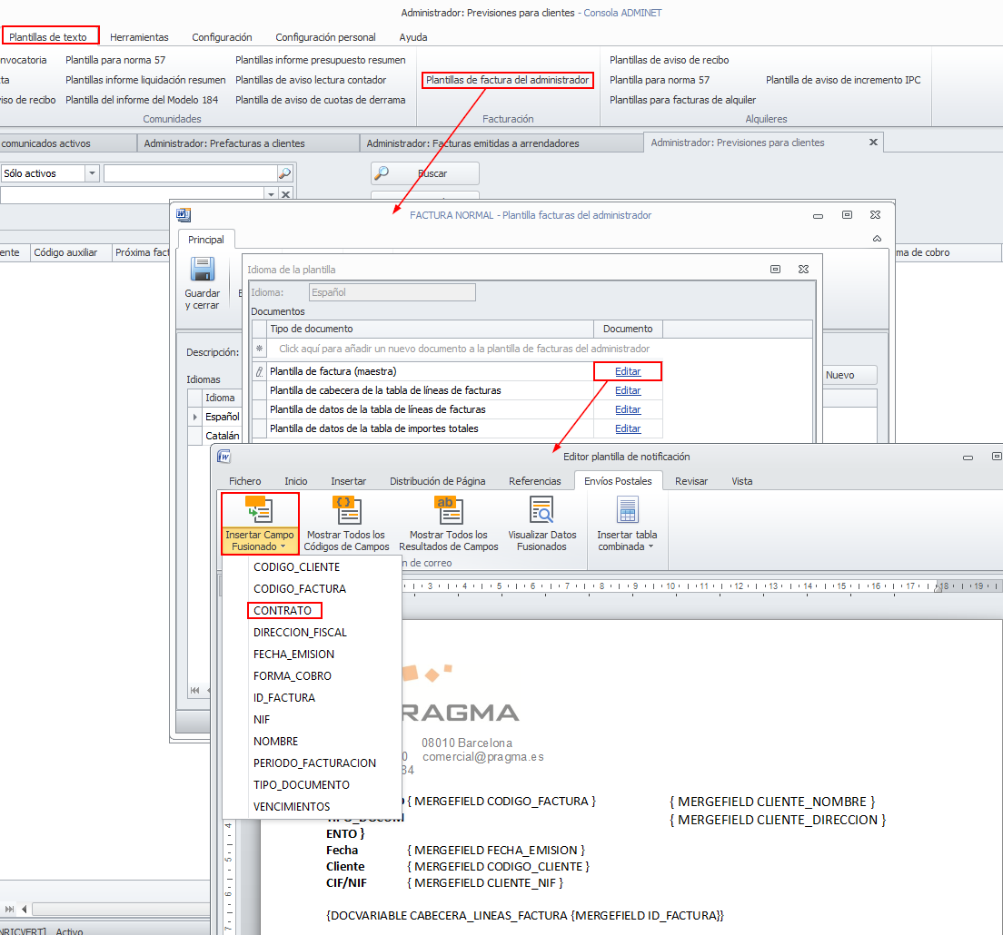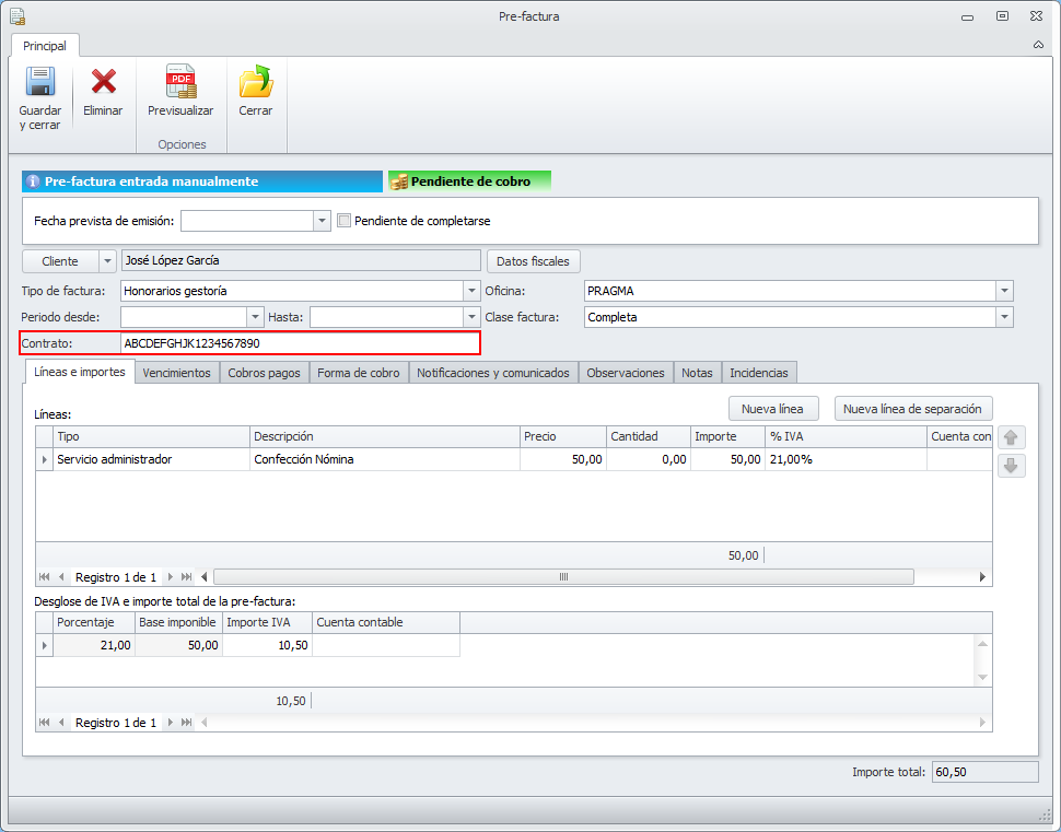 Se ha añadido una nueva casilla en los datos de la previsión, pre-factura y factura del administrador (clientes, comunidades y arrendadores) que permite al usuario introducir un número de contrato.