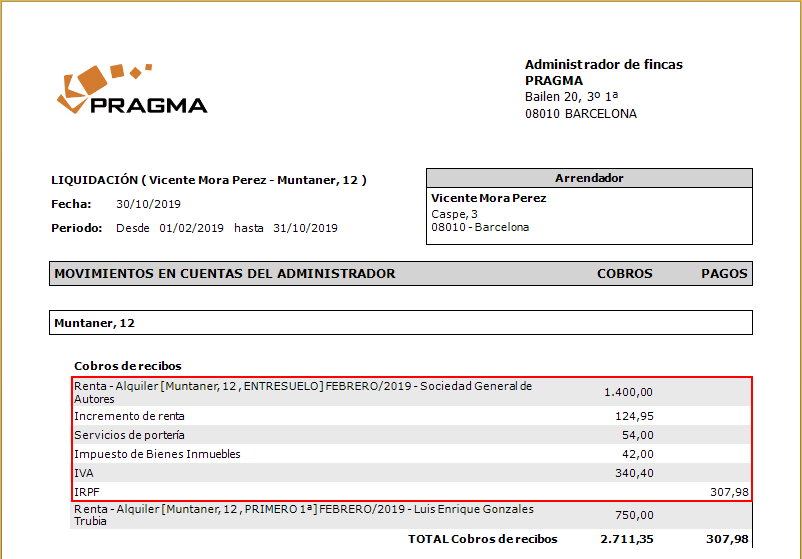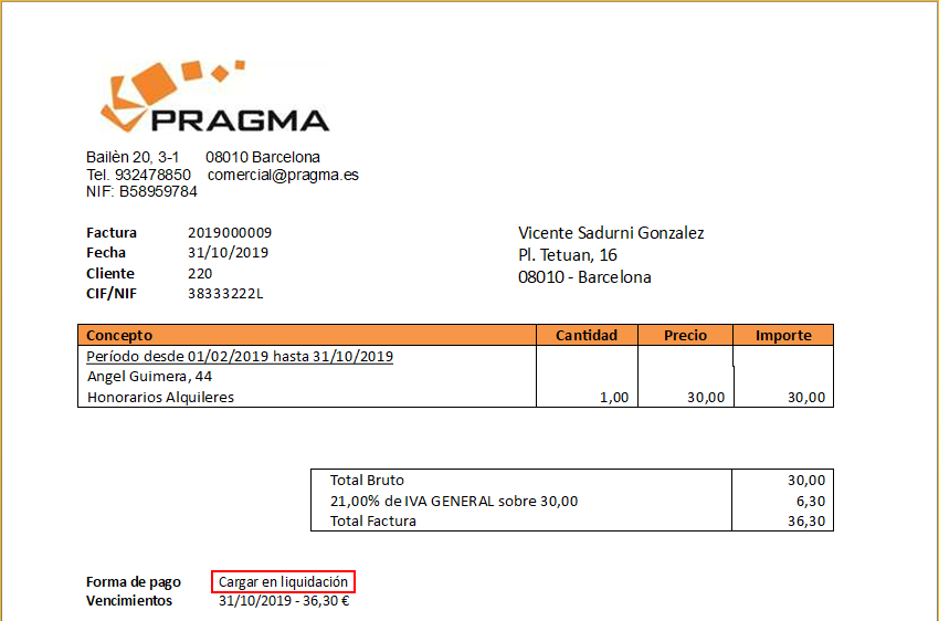 Se ha modificado el documento correspondiente a la factura de honorarios de administración. Si la comunidad o arrendador destinatario de la factura se administra con cuenta bancaria de administrador, como forma de pago se indica Cargar en liquidación.
