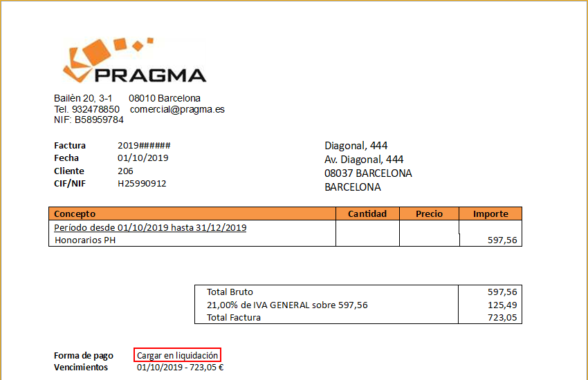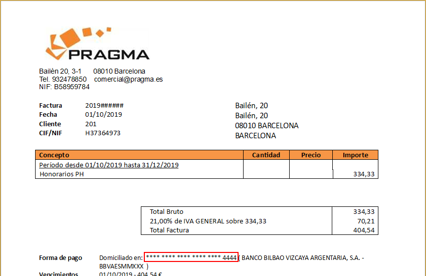 Se ha modificado el documento correspondiente a la factura de honorarios de administración. Si la forma de pago es domiciliación, se muestran sólo los 4 últimos dígitos de la cuenta bancaria.