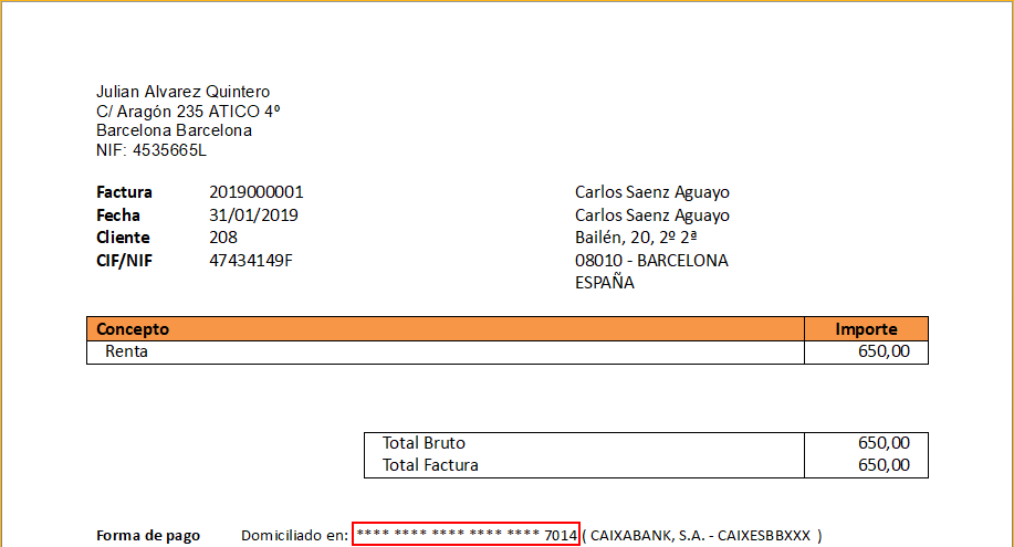 Se ha modificado el documento correspondiente a la factura de alquiler. Si la forma de pago es domiciliación, se muestran sólo los 4 últimos dígitos de la cuenta bancaria.
