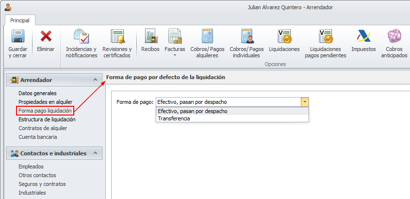 En la ficha de los arrendadores que se administran con cuenta bancaria propia, se ha incorporado una sección Forma pago liquidación, para que se pueda escoger la forma de pago de las liquidaciones. Se pueden escoger las mismas que para los arrendadores que se gestionan con cuenta del administrador, excepto Traspasar a perceptor. Tampoco se contempla la opción de Múltiples pagadores.