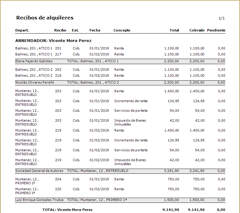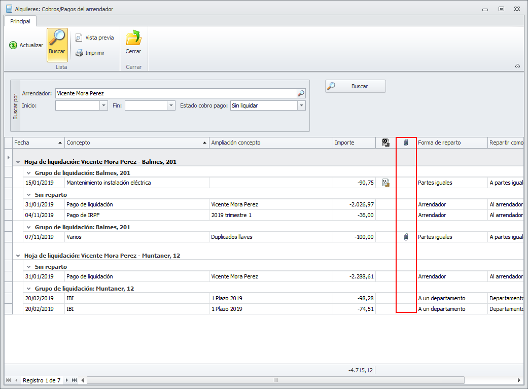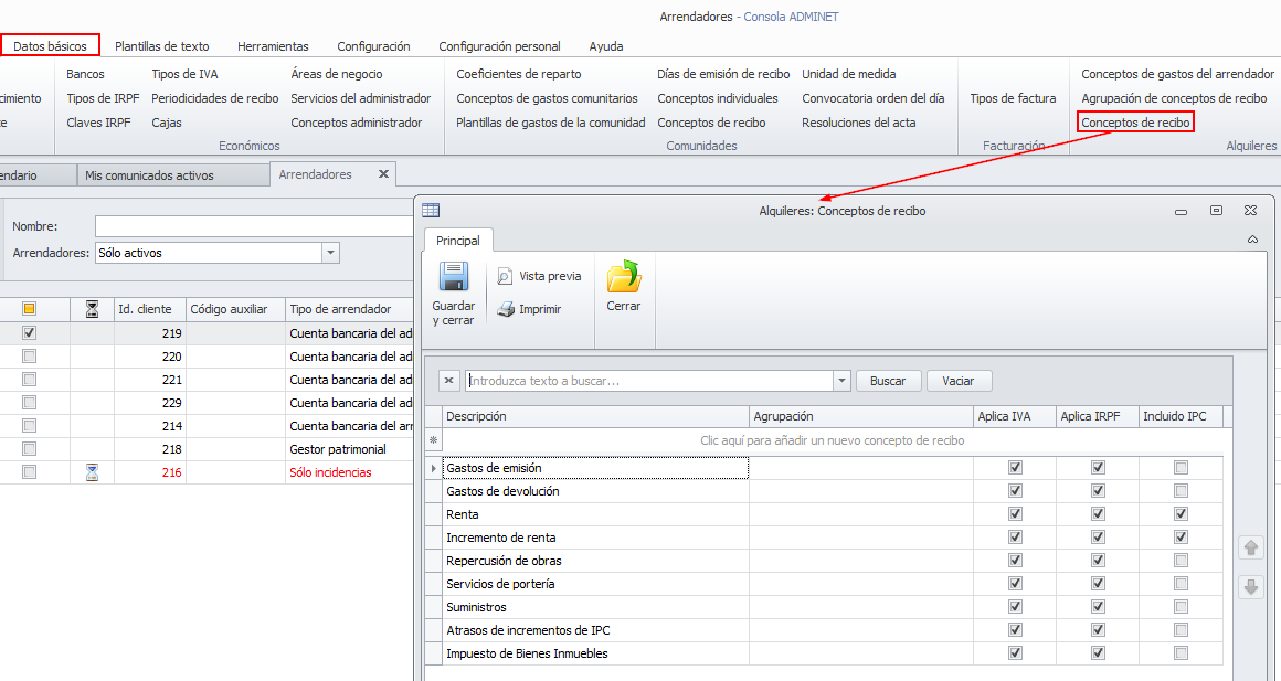 Se ha modificado la liquidación para que, en el caso de que el arrendador tenga activada, en la sección Configuración, la casilla Desglosar las líneas de los cobros de recibos, al desglosar los conceptos, los muestre en el mismo orden que se puede ver en la tabla de conceptos de recibo del menú Datos básicos.