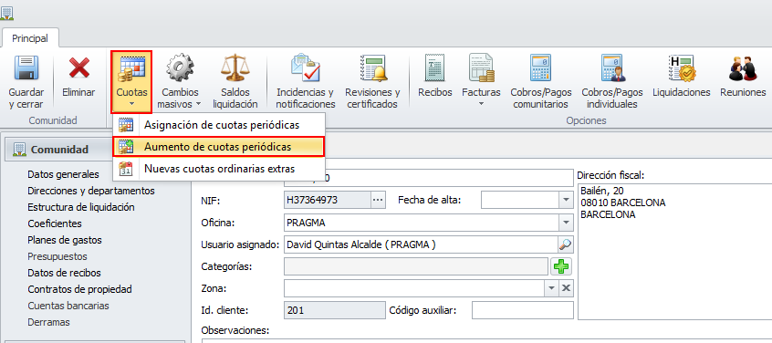 La opción Aumento de cuotas periódicas, se puede encontrar en la parte superior de la ficha de la comunidad.