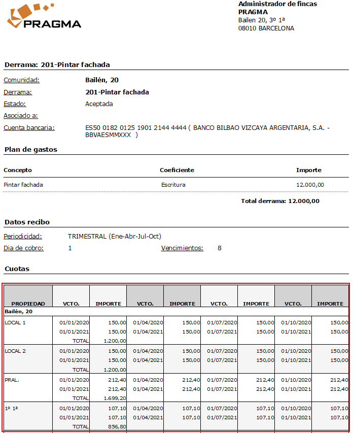 Se ha modificado el informe de la derrama, una vez aceptada para que muestre un detalle de los vencimientos por cada departamento en el mínimo espacio y de la forma más clara posible.