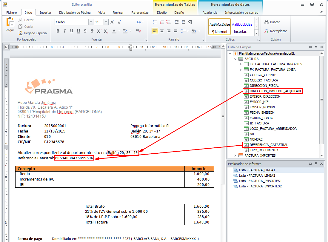 Se añaden nuevos campos para permitir mostrar la dirección del inmueble alquilado y su referencia catastral. Si desea añadir estos datos a la factura, debe modificar la plantilla de texto que esté usando para su emisión.