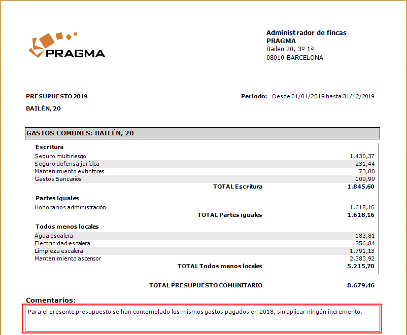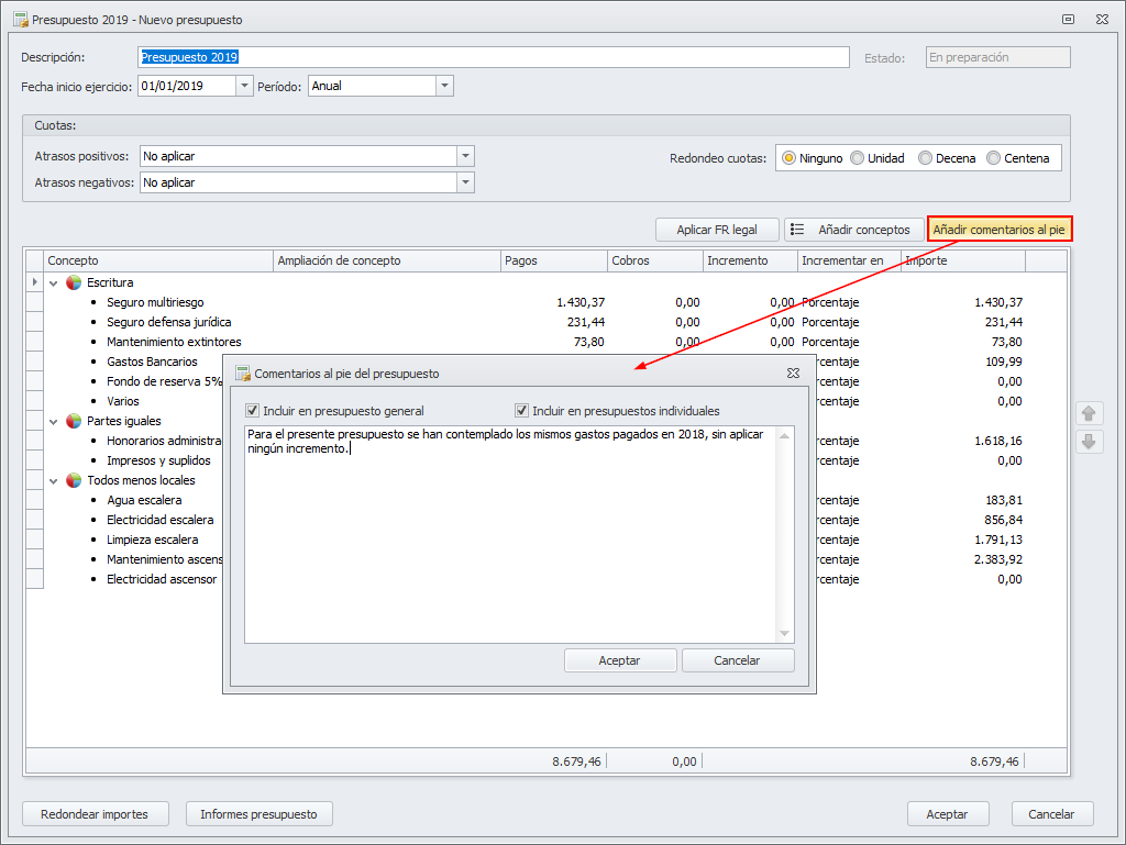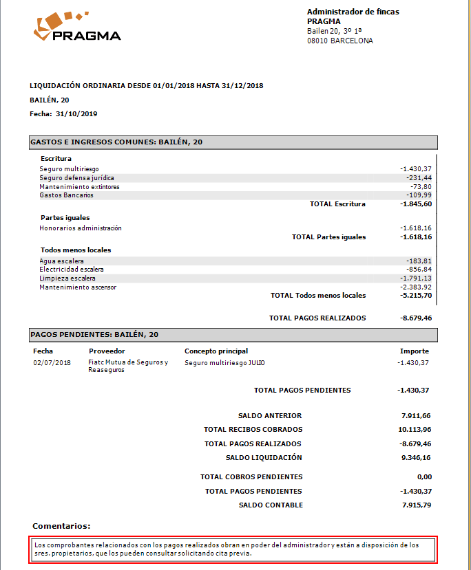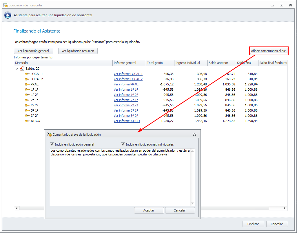 Añadir comentarios al pie de las liquidaciones ordinarias y extraordinarias