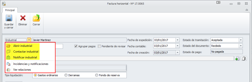 En todas las ventanas donde se muestra un industrial, arrendador, perceptor, inquilino o copropietario, se ha modificado la funcionalidad del botón asociado al contacto para que siempre permita, además de otras, las opciones Abrir, Contactar y Notificar.