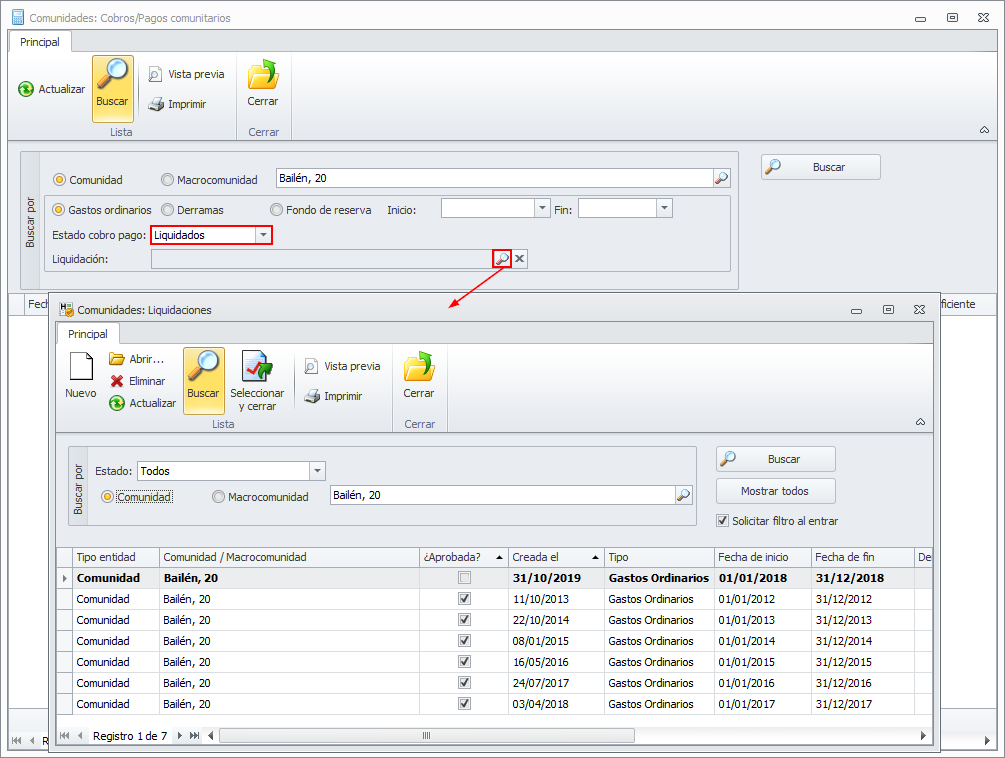 Se han modificado las vistas de cobros pagos comunitarios y cobros pagos individuales para que, en el caso de escoger el estado Liquidados, permita escoger una de las liquidaciones de la comunidad.