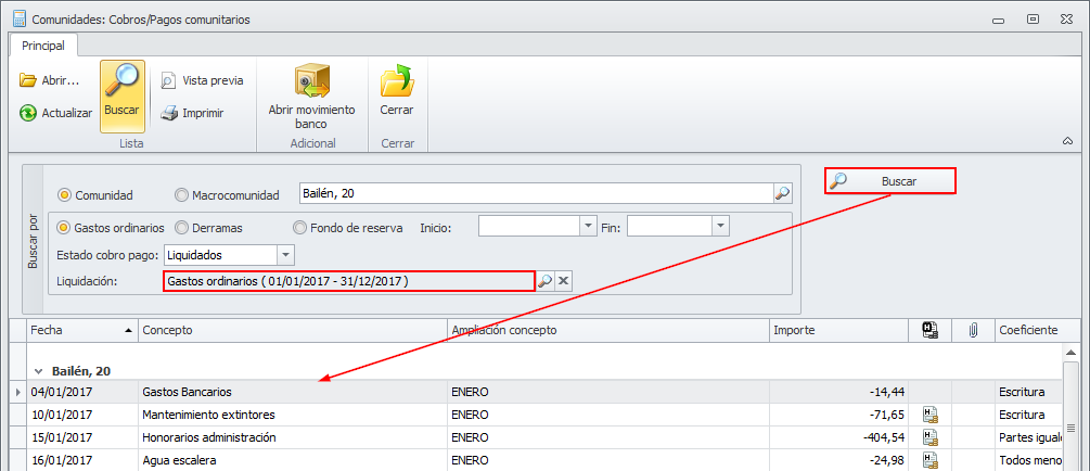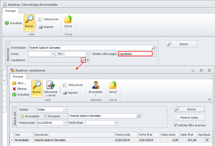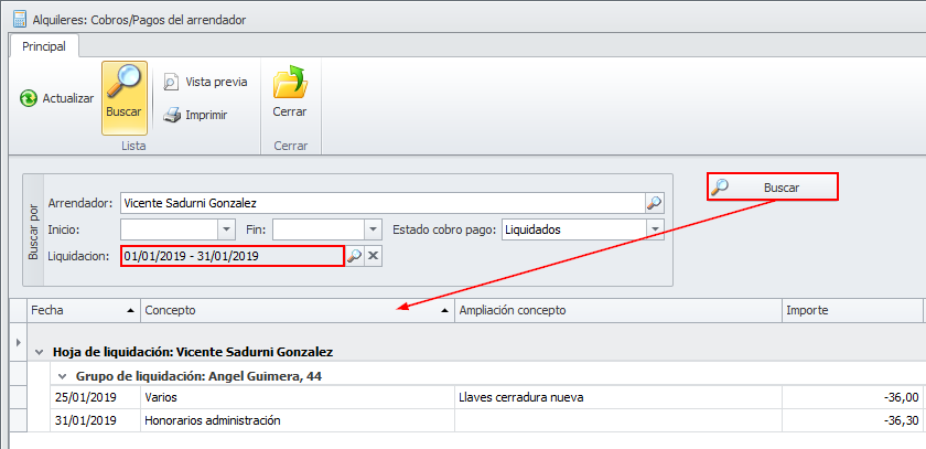 Al hacer clic en Buscar, se filtrarán los cobros pagos, mostrando sólo los incluidos en la liquidación seleccionada.