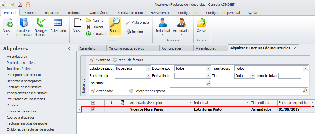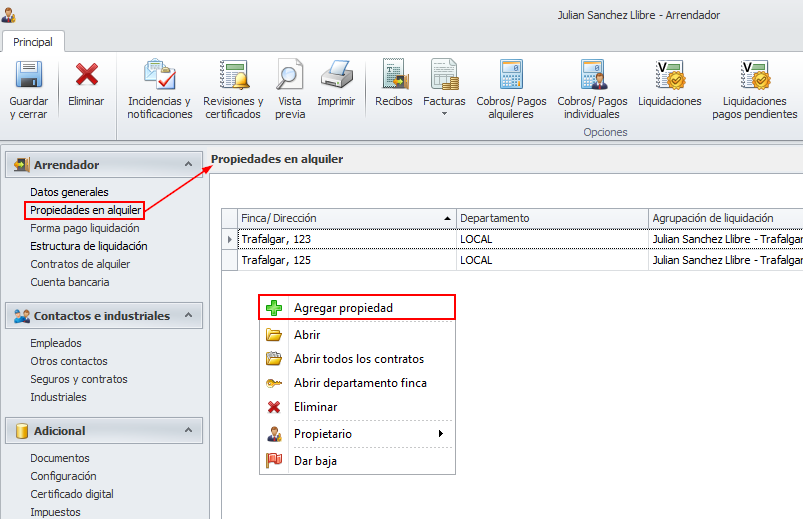 En el caso de seleccionar más de un arrendador o perceptor a la vez, se ajustan las opciones del menú Principal y las opciones del botón derecho del ratón para mostrar únicamente las que están permitidas para una selección múltiple.