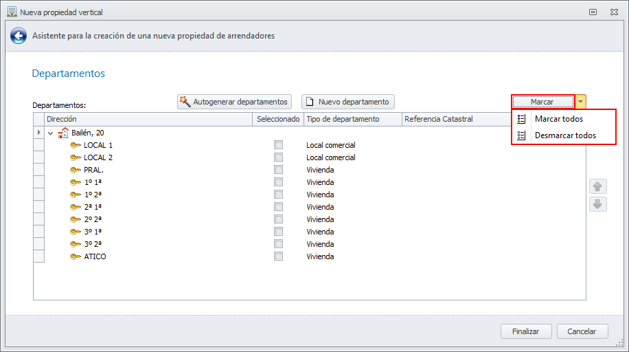 Se ha mejorado el asistente para agregar propiedades a un arrendador para que, en el caso de que la finca seleccionada no esté marcada como Finca entera en régimen de vertical, al mostrar los departamentos para que el usuario seleccione los que desea añadir, disponga del botón Marcar, con las opciones Marcar todos y Desmarcar todos.