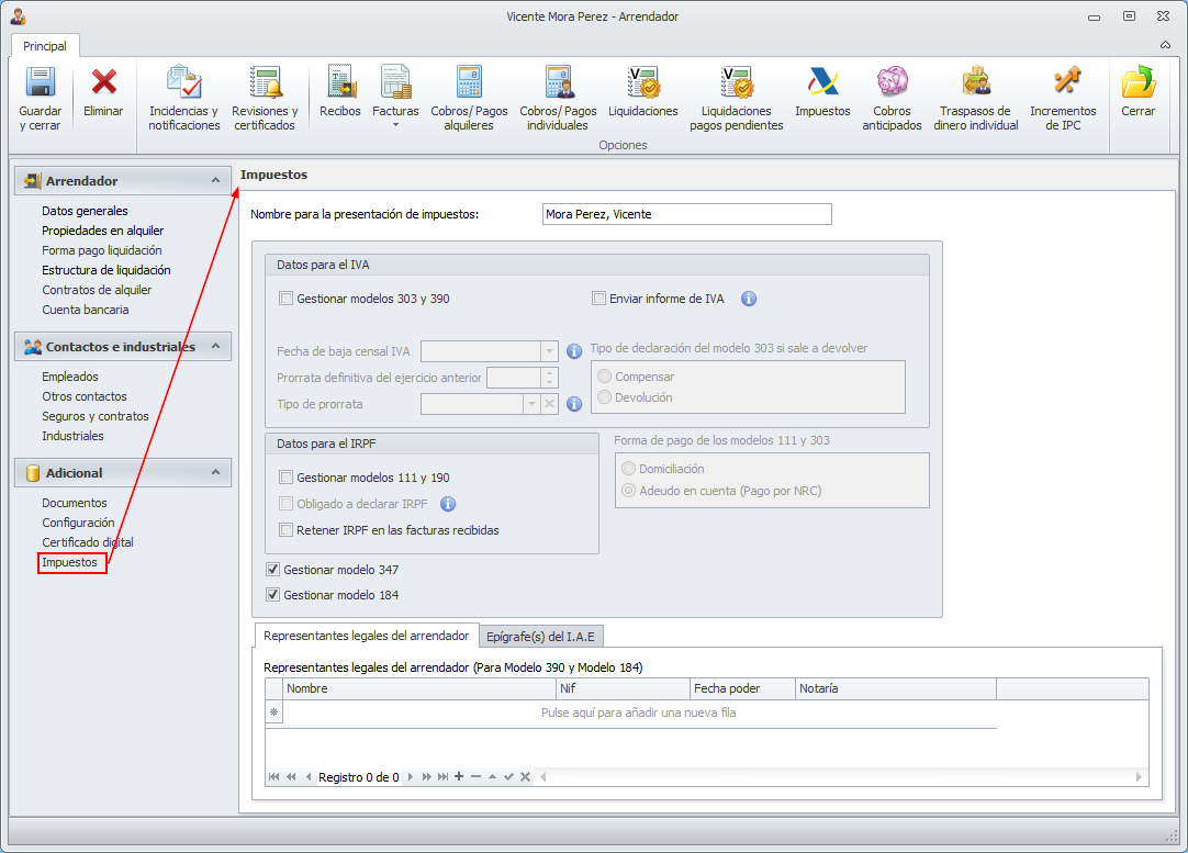 Se han reordenado los datos localizados en la sección Impuestos de la ficha del arrendador, quedando del siguiente modo: