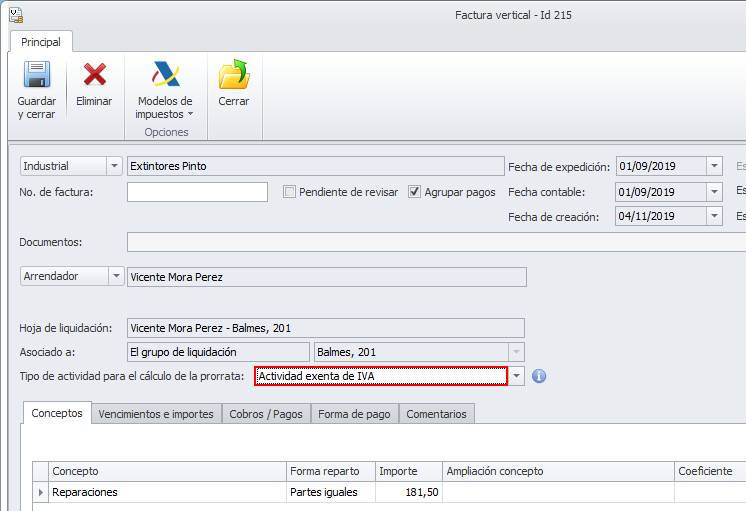 Ajustes en "Tipo de actividad para el cálculo de la prorrata" de las facturas de industriales y "Otras facturas recibidas del arrendador"